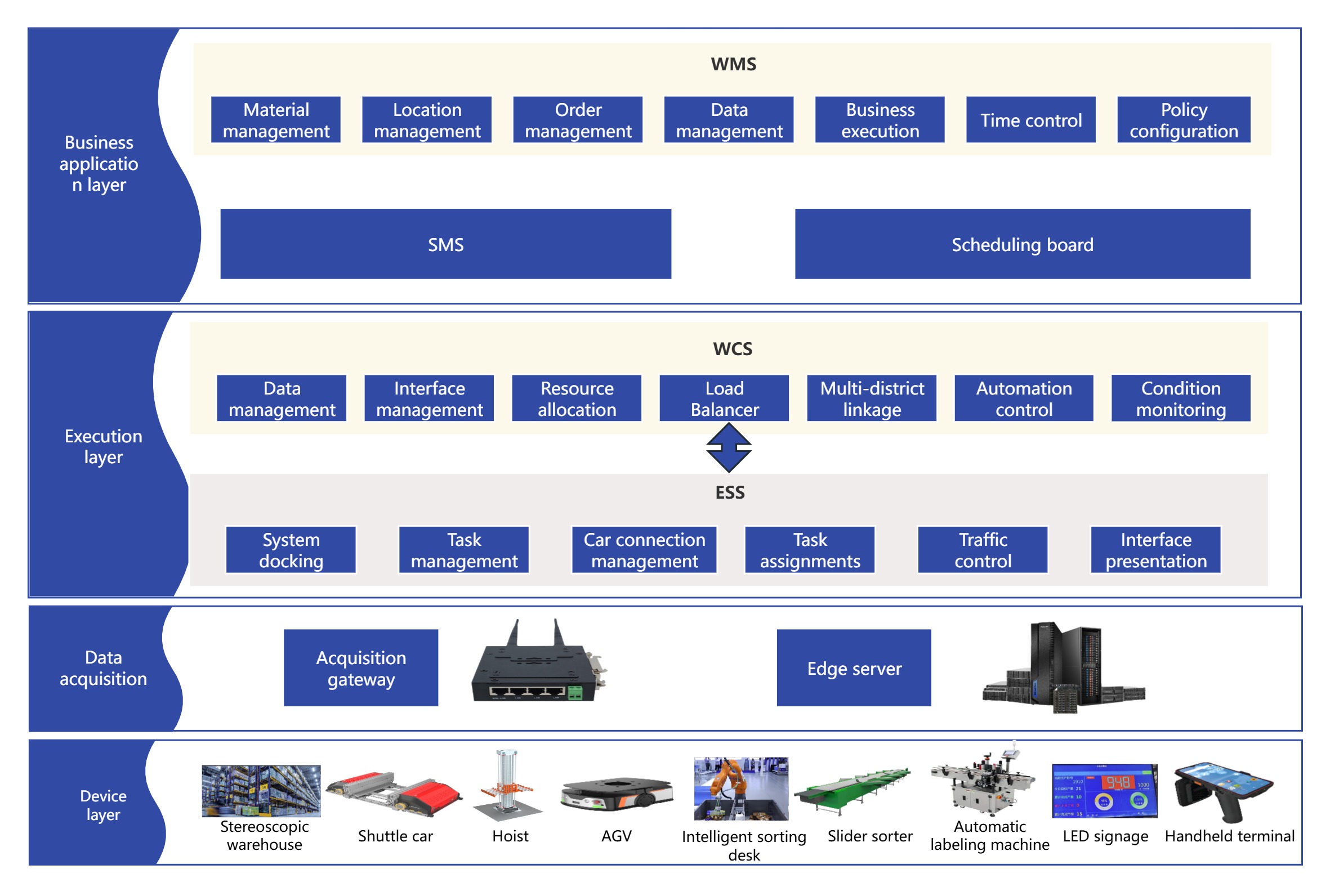The smart warehousing solution has a four - layer architecture: The device layer connects hardware such as stereoscopic warehouses and AGVs, linked via gateways/edge servers in the data collection layer; the execution layer’s WCS is responsible for resource scheduling and multi - zone linkage, while ESS monitors task and equipment status; the business layer’s WMS coordinates core businesses like materials and orders, with SMS and scheduling dashboards assisting in execution. This achieves hardware interconnection, data integration, and intelligent collaboration.